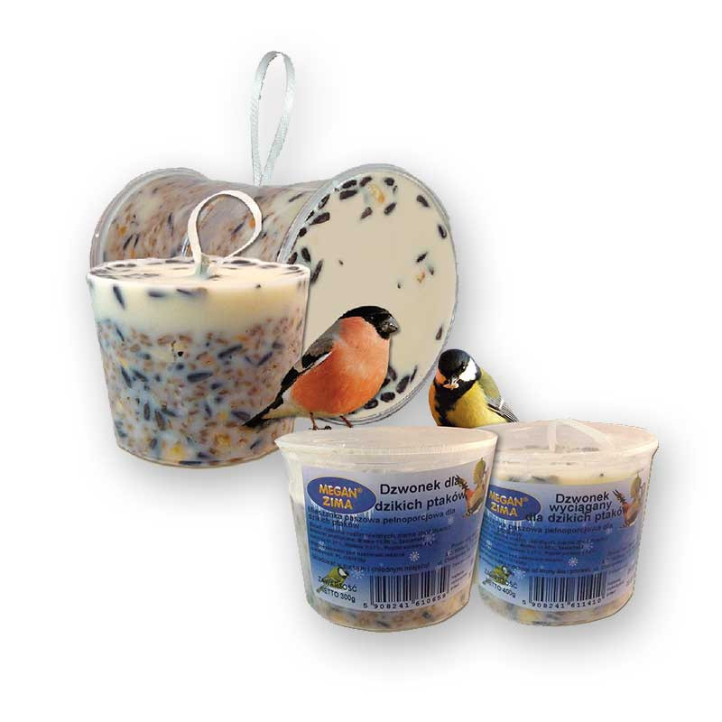Karma w dzwonku to doskonały sposób na dokarmianie ptaków zimą. Jest to mieszanina ziaren zbóż zatopionych w tłuszczu, którą ptaki jedzą z apetytem. Wygodne opakowanie sprawia, że dzwonek można łatwo zawiesić w dowolnym miejscu w ogrodzie lub na balkonie. Produkt występuje w 2 wariantach: